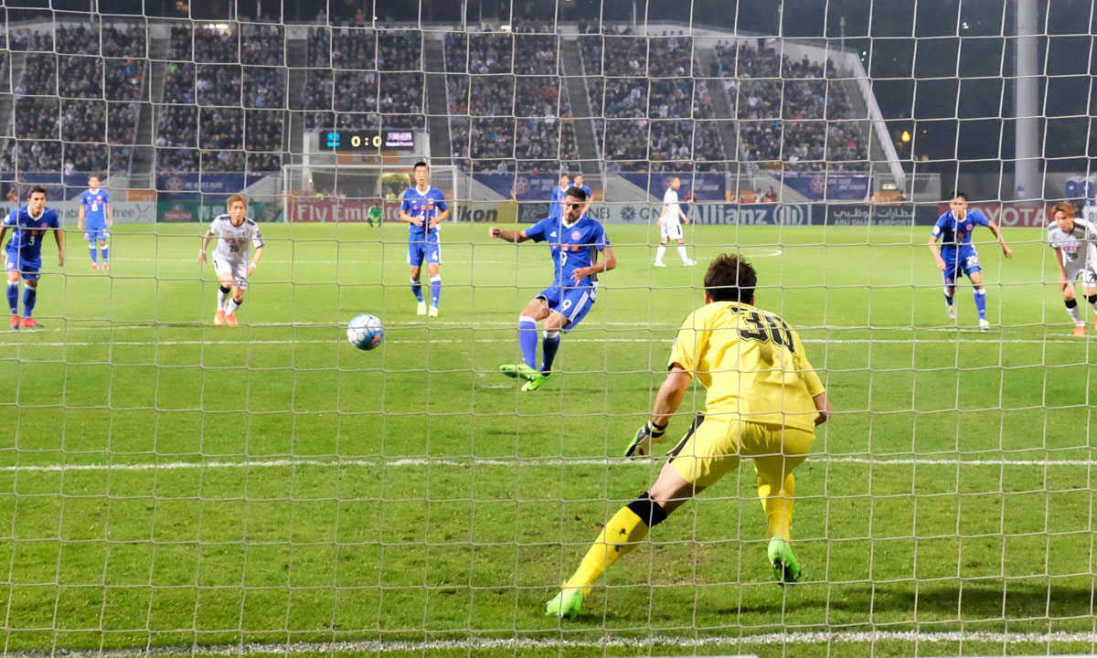 Manuel Bleda celebrates his penalty goal against Kawasaki (Photo: Ryan Kam).