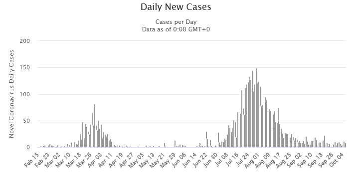 The number of new cases has dropped drastically since early August. (Credit: Worldometer)